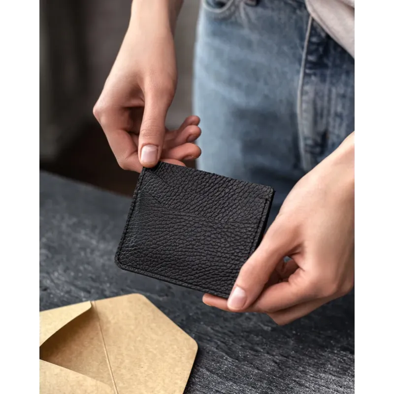 Компактный кожаный холдер для пластиковых карт и купюр, можно носить в кармане джинсов. 4 кармашка для пластиковых карт и одно отделение для купюр, сложенных пополам. Правая сторона картхолдера без прошивки, чтобы было удобнее вкладывать и доставать наличные.