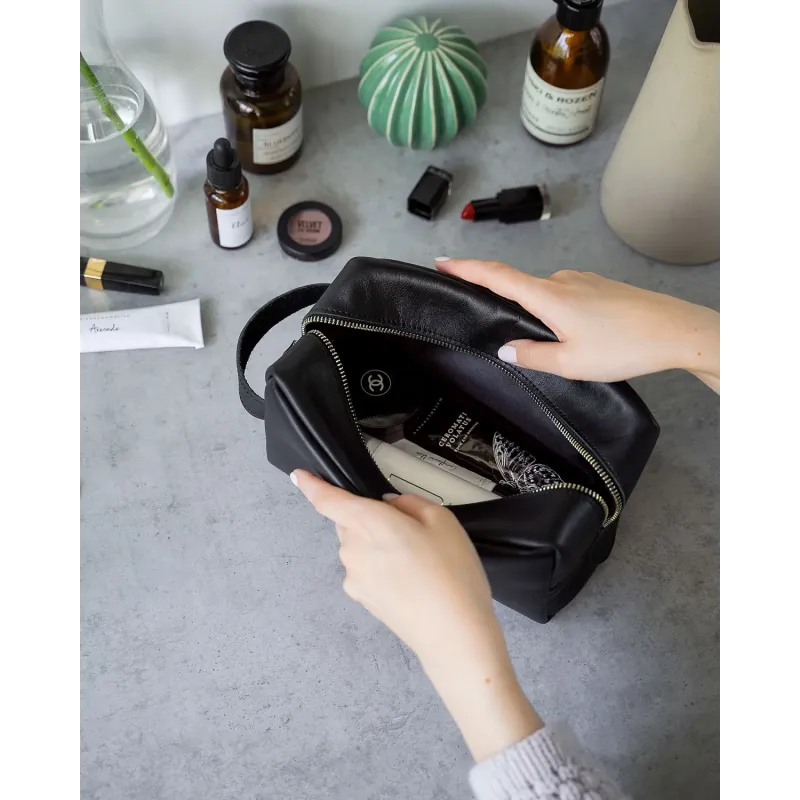 Кожаный несессер подойдет для поездок, походов в бассейн, спортзал или просто для хранения косметики. Изготовлен из мягкой эластичной натуральной кожи, внутри черная тканевая подкладка. Одно основное отделение вмещает косметические средства среднего или дорожного объема — шампунь, гель для душа, зубную пасту и щетку, расческу, кремы, влажные салфетки и другие повседневные вещи.