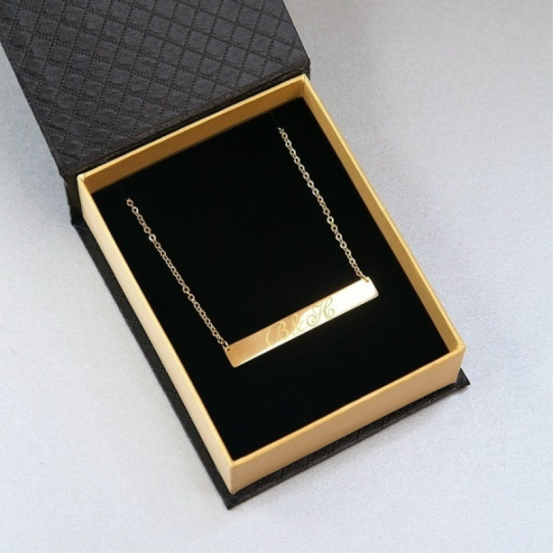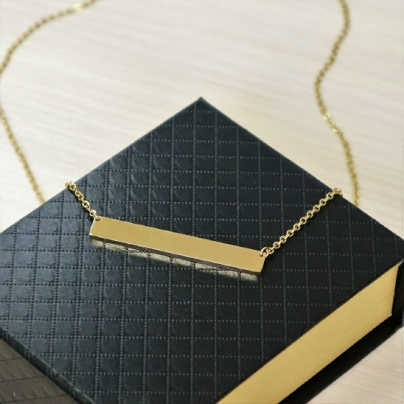 Характеристики > Материал подвески: ювелирная сталь > Материал цепочки: ювелирная сталь > Размер подвески: 5х0,7 см > Длина цепочки: 55 см > Цвет: золото