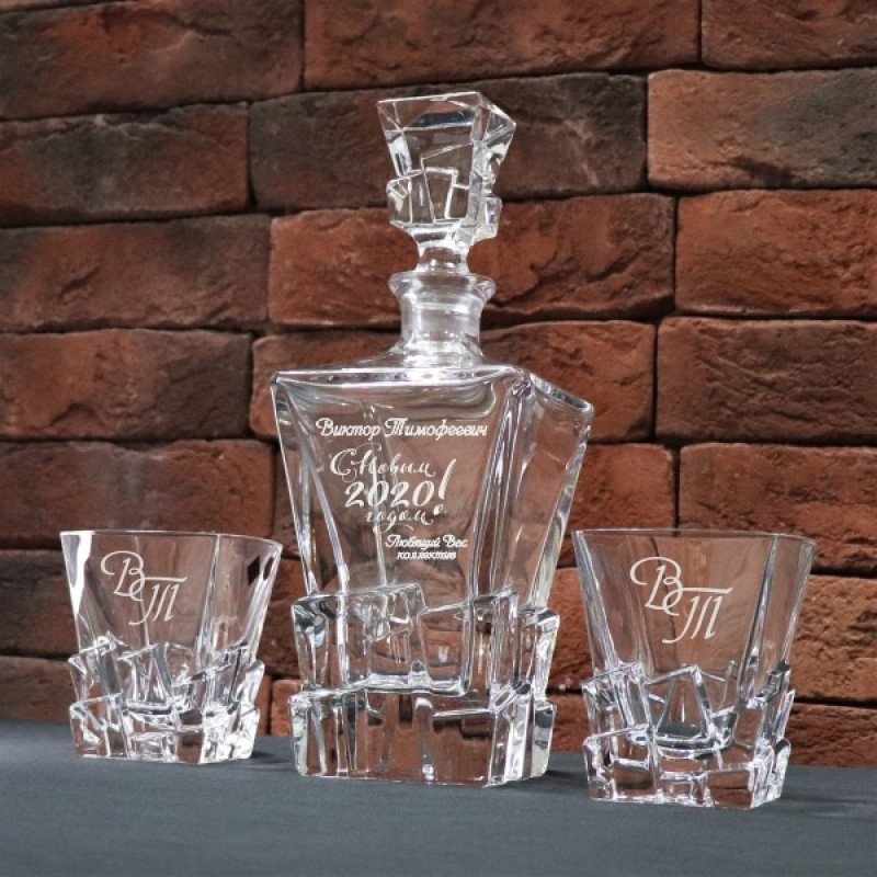 Если вы ищете подарок человеку, у которого все есть, которого сложно удивить, кто любит качественные и необычные вещи – то этот набор мы создали специально для вас. Набор штоф и два бокала для виски в подарочной коробке из натурального дерева станет отличным выбором подарка руководителю, главе семейства, врачу, другу на Юбилей. Штоф и бокалы выполнены из хрусталевидного богемского стекла, известного своим качеством, прочностью и особой прозрачностью. Необычный дизайн, имитирующий кубики льда, оригинальная форма выгодно выделяют подарок среди прочих и подойдут одариваемому любого возраста. Гравировку возможно сделать на каждом предмете набора. На штофе это может быть дизайн, цитата, логотип. На бокалах – инициалы монограммой. На коробке поздравление, также лого или дизайн. Наш мастер подберет шрифт, утвердит с вами макет. Нанесение мы делаем на лазерном оборудовании. На стекле такая гравировка получается светло-белым цветом и становится контрастной и яркой при наполнении сосуда. На дереве нанесение темное и яркое. В стоимость входит гравировка на трех предметах. Гравировка на коробке оплачивается дополнительно и стоит 350 рублей.