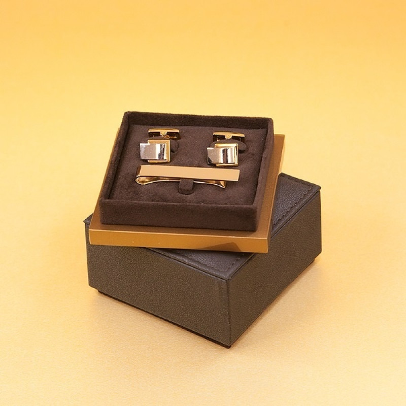 Характеристики > Цвет запонок: серебристый/золотистый > Цвет зажима: золотистый > Размер запонок: 17х12 мм > Размер зажима: 42х5 мм > Материал: ювелирная сталь > Коробка: эко-кожа