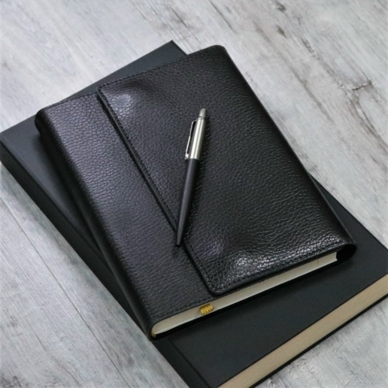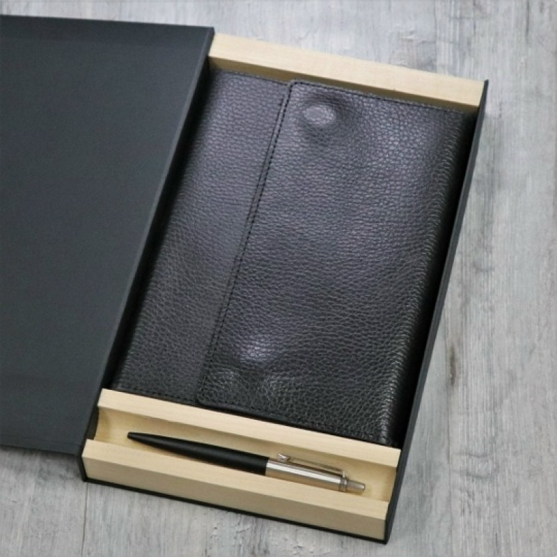 Характеристики > Цвет: черный > Материал: натуральная кожа > Формат: А5 > Цвет листов внутри: слоновая кость > Блок: линейка > 365 листов > Ручка Parker: > Цвет ручки: черный/серебро > Цвет стержня: синий > Материал: Латунь, нержавеющая сталь > Вид гравировки: Алмазная гравировка > Механизм: Шариковая > Размер пишущего узла: М (medium) - Средний 1 мм