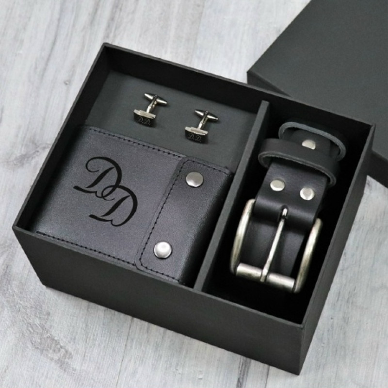 Характеристики > Запонки: > Материал: ювелирная сталь > Цвет: серебро, вставка мокрый асфальт > Размер: 17х12мм > Портмоне: > Материал: натуральная кожа > Размер: 9х11,5см > Цвет: черный > Ремень: > Цвет: черный > Материал: натуральная кожа > Ширина: 4 см > Длина: до 125 см > Упаковка: подарочная упаковка Примечания * Уважаемый клиент! На всех подарках, представленных на сайте, мы сделаем индивидуальную гравировку по вашему заказу. В качестве примера мы показали на фото, как это может быть. Вы всегда можете сами создать свой особенный дизайн, подробно описав в окошке выше текст, свое видение расположения текста и пожелания по шрифту (например, хочу строгий печатный или наоборот прописной с вензелем).После того как вы оформите заказ с вами обязательно будет связываться менеджер для уточнения деталей и ваших пожеланий, вы еще раз все проговорите. По вашему заданию наш дизайнер изготовит макет гравировки. Но эта работа занимает время, иногда целый день, поэтому просим не волноваться, а довериться нам. Макет обязательно будет готов, но без вашего утверждения мы не приступим к исполнению. Просим при утверждении макета проверять правильность написания текста и фамилии. Допускается до 2х корректировок макета, поэтому просим задание писать четко и подробно. Также заказ возможно оформить через WhatsApp мессенджер, направив всю необходимую информацию и пожелания по одному из указанных номеров. Стоимость гравировки на двух предметах на ваш выбор включена в стоимость, и не зависит от количества символов. Каждая дополнительная гравировка стоит 350 рублей. Разработка рисунков и логотипов оплачивается отдельно, стоимость зависит от сложности. ** Нанесение текста выполняется методом лазерной и алмазной гравировок. Во время гравировки удаляется тонкий верхний слой покрытия, благодаря чему появляется надпись, которая не стирается и не тускнеет со временем. Если у Вас остались вопросы о данном товаре, или возникли проблемы при оформлении заказа, Вы всегда можете позвонить нам по телефону +7 495 120 70 45, и наши менеджеры с удовольствием ответят на все вопросы, а также помогут оформить заказ, или примут заказ по телефону.