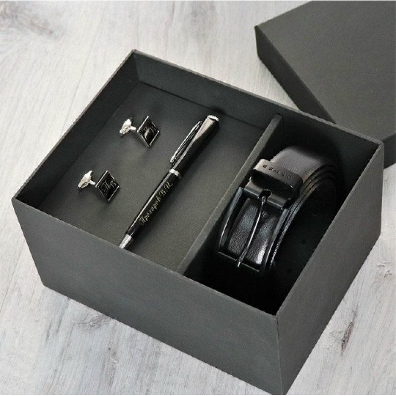 Характеристики > Запонки: > Материал: ювелирная сталь > Цвет: серебро, вставка мокрый асфальт > Размер: 16х16мм > Ручка Pierre Cardin: > Ручка: шариковая > Корпус и колпачок: латунь с лакированным покрытием > Цвет деталей дизайна: серебристый > Цвет ручки: черный > Метод гравировки: алмазная гравировка > Ремень Cross: > Цвет: черный > Материал: натуральная кожа наппа гладкая > Ширина: 3 см > Длина: до 126 см > Вес: 310гр > Упаковка: подарочная упаковка Примечания * Уважаемый клиент! На всех подарках, представленных на сайте, мы сделаем индивидуальную гравировку по вашему заказу. В качестве примера мы показали на фото, как это может быть. Вы всегда можете сами создать свой особенный дизайн, подробно описав в окошке выше текст, свое видение расположения текста и пожелания по шрифту (например, хочу строгий печатный или наоборот прописной с вензелем).После того как вы оформите заказ с вами обязательно будет связываться менеджер для уточнения деталей и ваших пожеланий, вы еще раз все проговорите. По вашему заданию наш дизайнер изготовит макет гравировки. Но эта работа занимает время, иногда целый день, поэтому просим не волноваться, а довериться нам. Макет обязательно будет готов, но без вашего утверждения мы не приступим к исполнению. Просим при утверждении макета проверять правильность написания текста и фамилии. Допускается до 2х корректировок макета, поэтому просим задание писать четко и подробно. Также заказ возможно оформить через WhatsApp мессенджер, направив всю необходимую информацию и пожелания по одному из указанных номеров. Стоимость гравировки на двух предметах на ваш выбор включена в стоимость, и не зависит от количества символов. Каждая дополнительная гравировка стоит 350 рублей. Разработка рисунков и логотипов оплачивается отдельно, стоимость зависит от сложности. ** Нанесение текста выполняется методом лазерной и алмазной гравировок. Во время гравировки удаляется тонкий верхний слой покрытия, благодаря чему появляется надпись, которая не стирается и не тускнеет со временем. Если у Вас остались вопросы о данном товаре, или возникли проблемы при оформлении заказа, Вы всегда можете позвонить нам по телефону +7 495 120 70 45, и наши менеджеры с удовольствием ответят на все вопросы, а также помогут оформить заказ, или примут заказ по телефону.