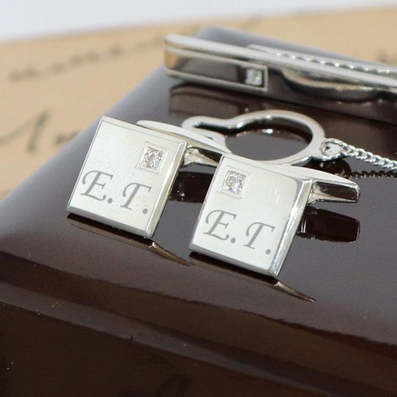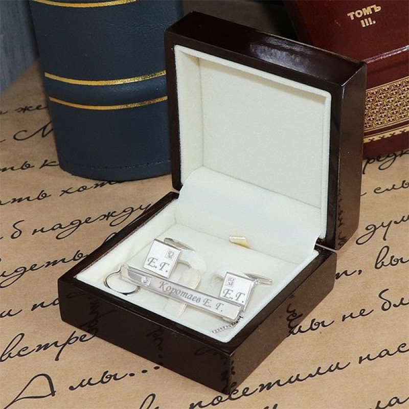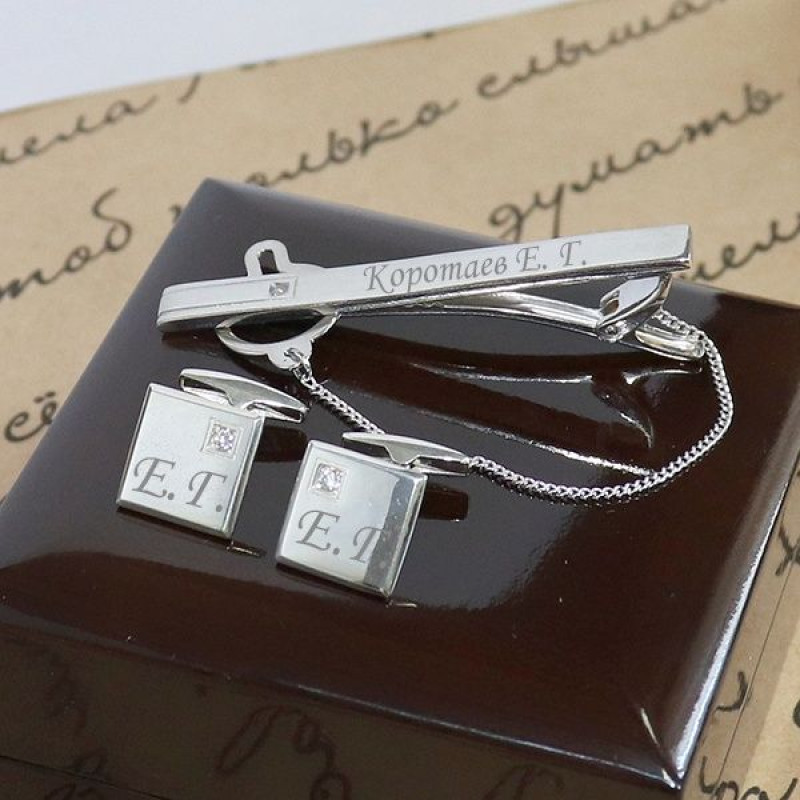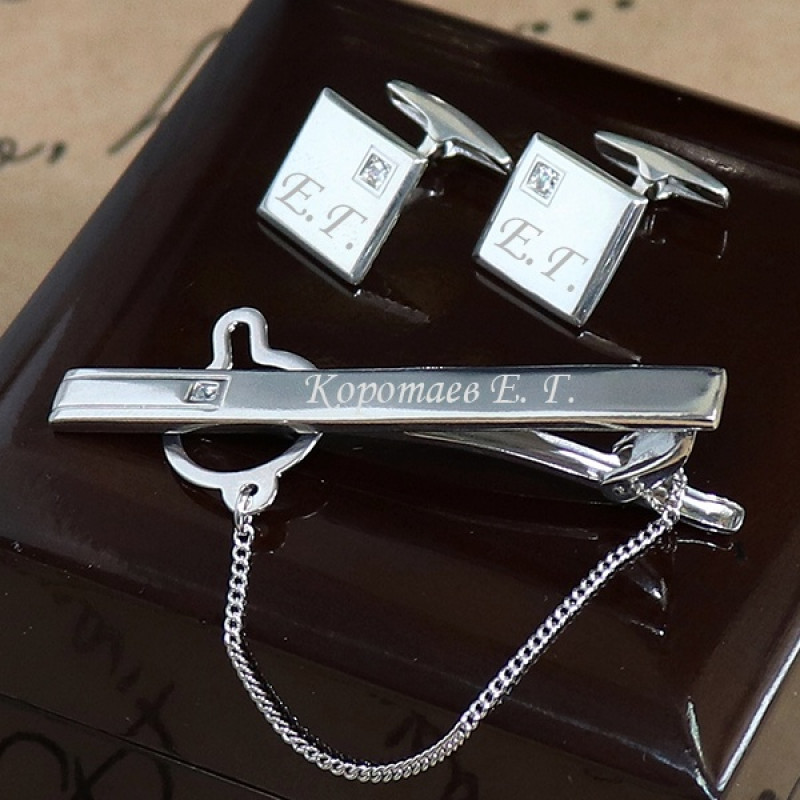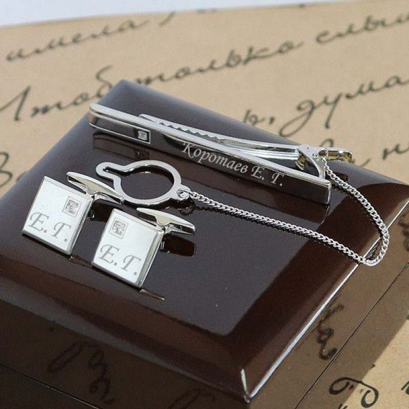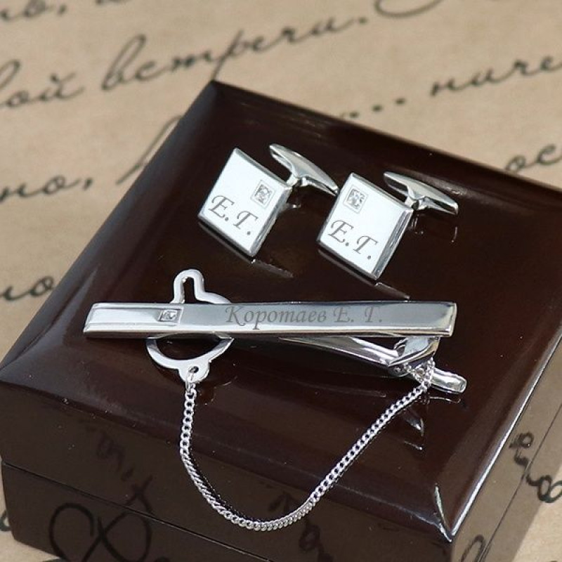 Подарочный набор с гравировкой запонки и зажим для галстука Swarovski