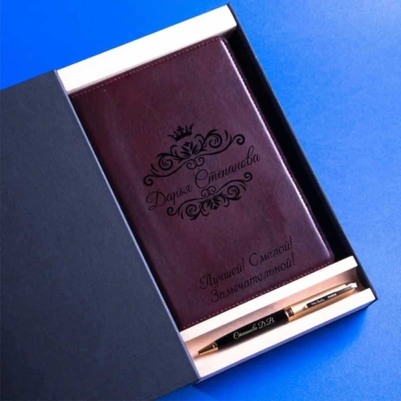На всех подарках, представленных на сайте, мы сделаем индивидуальную гравировку по вашему заказу. В качестве примера мы показали на фото, как это может быть. После того как вы оформите заказ с вами обязательно свяжется менеджер. По вашему заданию наш дизайнер изготовит макет гравировки. Просим при утверждении макета проверять правильность написания текста и фамилии. Также заказ возможно оформить через WhatsApp месседжер. Многие наши изделия собираются по принципу конструктора. Вы можете заменить в наборе ежедневник или ручку на ваш вкус. А также мы обязательно предложим альтернативу, если какой-то составляющей не окажется в наличии. Стоимость гравировки на одной стороне ежедневника и ручке (только текст) включена в стоимость, и не зависит от количества символов. Каждая дополнительная гравировка стоит 350 рублей. Разработка рисунков и логотипов оплачивается отдельно.