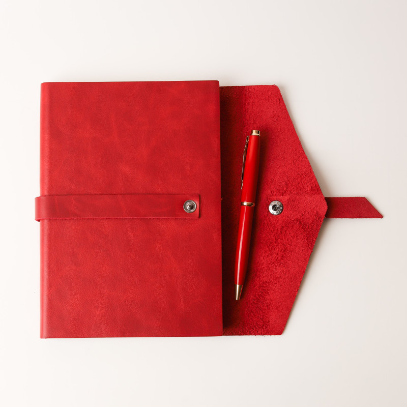 Кожа для этой обложки обработана и защищена от грязи с внешней стороны. Лаконичный дизайн с застежкой на кнопку и декоративной горизонтальной полоской подойдет деловому и творческому человеку на любых форматах встреч.