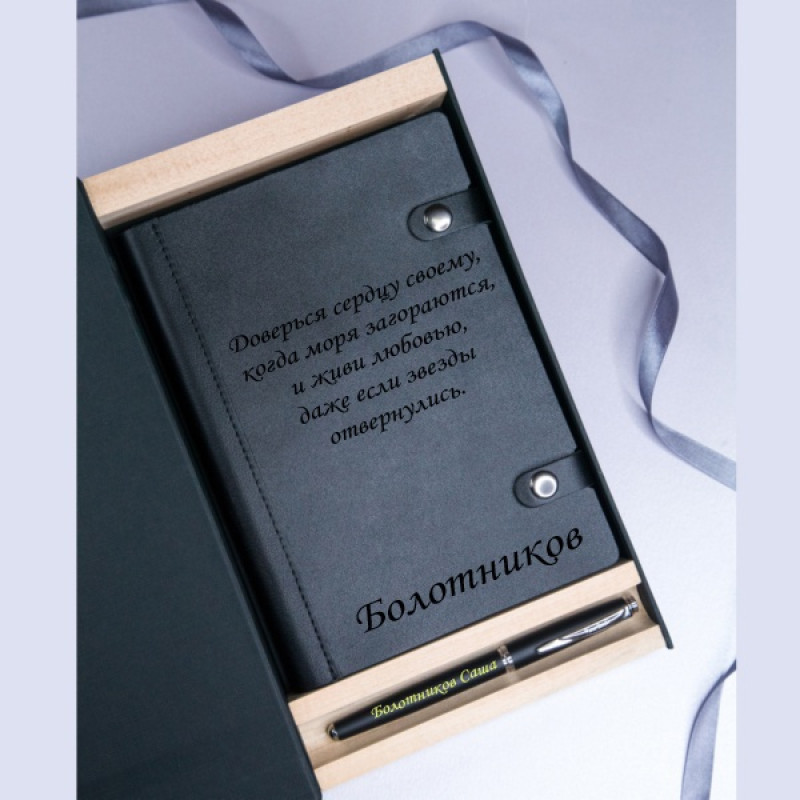 * Уважаемый клиент! На всех подарках, представленных на сайте, мы сделаем индивидуальную гравировку по вашему заказу. В качестве примера мы показали на фото, как это может быть. Вы всегда можете сами создать свой особенный дизайн, подробно описав в окошке выше текст, свое видение расположения текста и пожелания по шрифту (например, хочу строгий печатный или наоборот прописной с вензелем).После того как вы оформите заказ с вами обязательно будет связываться менеджер для уточнения деталей и ваших пожеланий, вы еще раз все проговорите. По вашему заданию наш дизайнер изготовит макет гравировки. Но эта работа занимает время, иногда целый день, поэтому просим не волноваться, а довериться нам. Макет обязательно будет готов, но без вашего утверждения мы не приступим к исполнению. Просим при утверждении макета проверять правильность написания текста и фамилии. Допускается до 2х корректировок макета, поэтому просим задание писать четко и подробно. Также заказ возможно оформить через WhatsApp месседжер, направив всю необходимую информацию и пожелания по одному из указанных номеров. Стоимость гравировки на одной стороне ежедневника и ручке включена в стоимость, и не зависит от количества символов. Каждая дополнительная гравировка стоит 350 рублей. Разработка рисунков и логотипов оплачивается отдельно, стоимость завсисит от сложности.