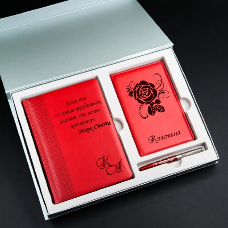 * Надпись на фотографии набора приведена в качестве примера. При заказе Вы указываете Ваш текст для гравировки. Сделать это можно в специальном поле выше. Вы можете выбрать подходящую фразу из предложенного каталога, или предложить свою. Стоимость гравировки на ежедневнике, визитнице и на одной стороне ручки включена в стоимость и не зависит от количества символов. Дополнительная гравировка (на второй стороне ручки) стоит 350 рублей.