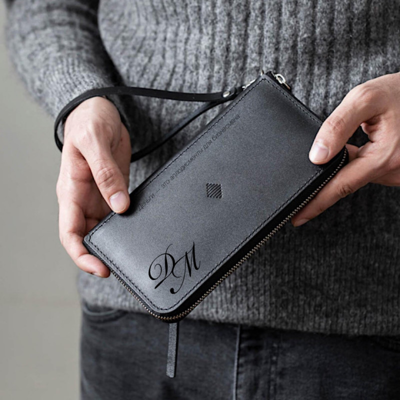 Стильное мужское портмоне из черной матовой натуральной кожи премиум класса на молнии. Портмоне вместительное и очень удобное для повседневной жизни. Если ваш мужчине не любит убирать портмоне в карманы и предпочитает больше носить его в руках – это портмоне то что вам нужно. Тем более, что портмоне оснащено удобной кожаной ручкой. В портмоне бесконечное множество отделений для купюр, карт, мелочи, документов и даже мобильного телефона. Именная гравировка на таком портмоне сделает подарок поистине уникальным и оригинальным. Гравировку наш мастер может сделать либо на внешней стороне кошелька, либо на внутренней. Это могут быть инициалы, цитата или слова любви. Портмоне с гравировкой точно не оставит вашего одариваемого равнодушным и станет настоящим талисманом, приносящим удачу и благополучие.