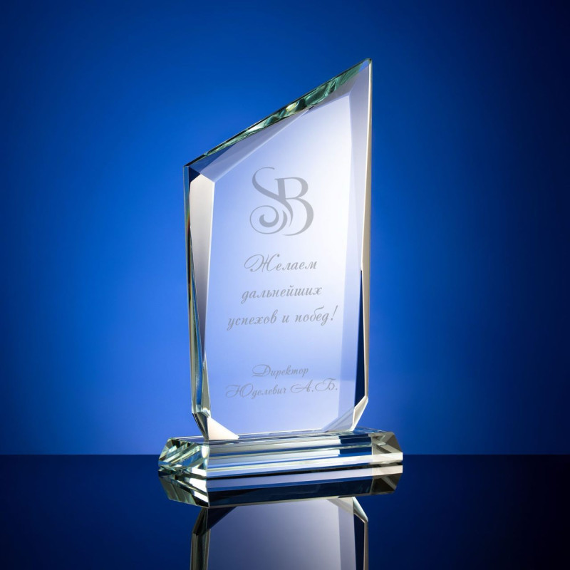 Стела изготовлена из стекла К9, в основе которого лежит оптическое боросиликатное стекло. Эту марку стекла отличает низкий процент посторонних включений, высокий показатель преломления и высокая прозрачность — идеальные качества для изготовления наград премиального уровня.