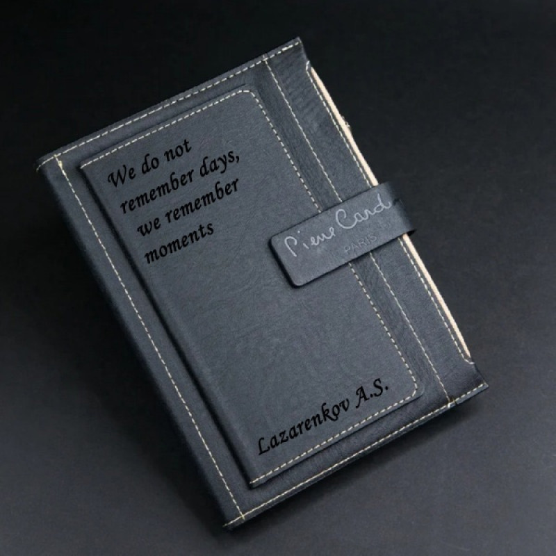 * Уважаемый клиент!На всех подарках, представленных на сайте, мы сделаем индивидуальную гравировку по вашему заказу. В качестве примера мы показали на фото, как это может быть. Вы всегда можете сами создать свой особенный дизайн, подробно описав в окошке выше текст, свое видение расположения текста и пожелания по шрифту (например, хочу строгий печатный или наоборот прописной с вензелем).После того как вы оформите заказ с вами обязательно будет связываться менеджер для уточнения деталей и ваших пожеланий, вы еще раз все проговорите. По вашему заданию наш дизайнер изготовит макет гравировки. Но эта работа занимает время, иногда целый день, поэтому просим не волноваться, а доверится нам. Макет обязательно будет готов, но без вашего утверждения мы не приступим к исполнению. Просим при утверждении макета проверять правильность написания текста и фамилии. Допускается до 2х корректировок макета, поэтому просим задание писать четко и подробно. Также заказ возможно оформить через WhatsApp месседжер, направив всю необходимую информацию и пожелания по одному из указанных номеров.Стоимость гравировки на одной стороне ежедневника включена в стоимость, и не зависит от количества символов. Каждая дополнительная гравировка стоит 350 рублей. Разработка рисунков и логотипов оплачивается отдельно, стоимость завсисит от сложности.